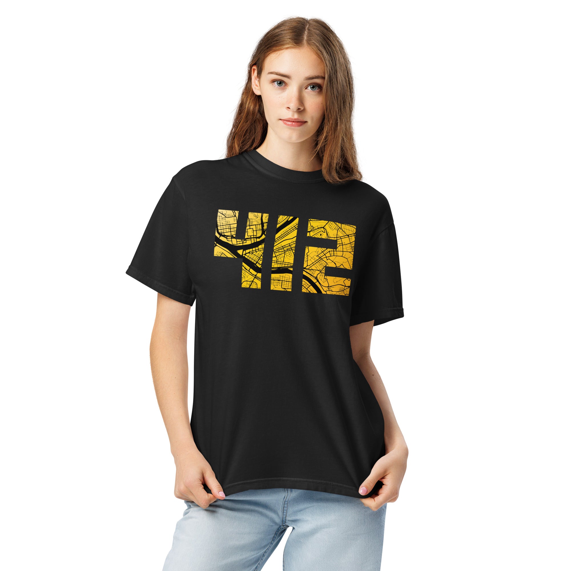 Designed in Squirrel Hill, Pittsburgh! This accurate street map of downtown Pittsburgh, Pennsylvania within the outline of the 412 area code is instantly recognizable to any yinzer or Pittsburgh sports fan.